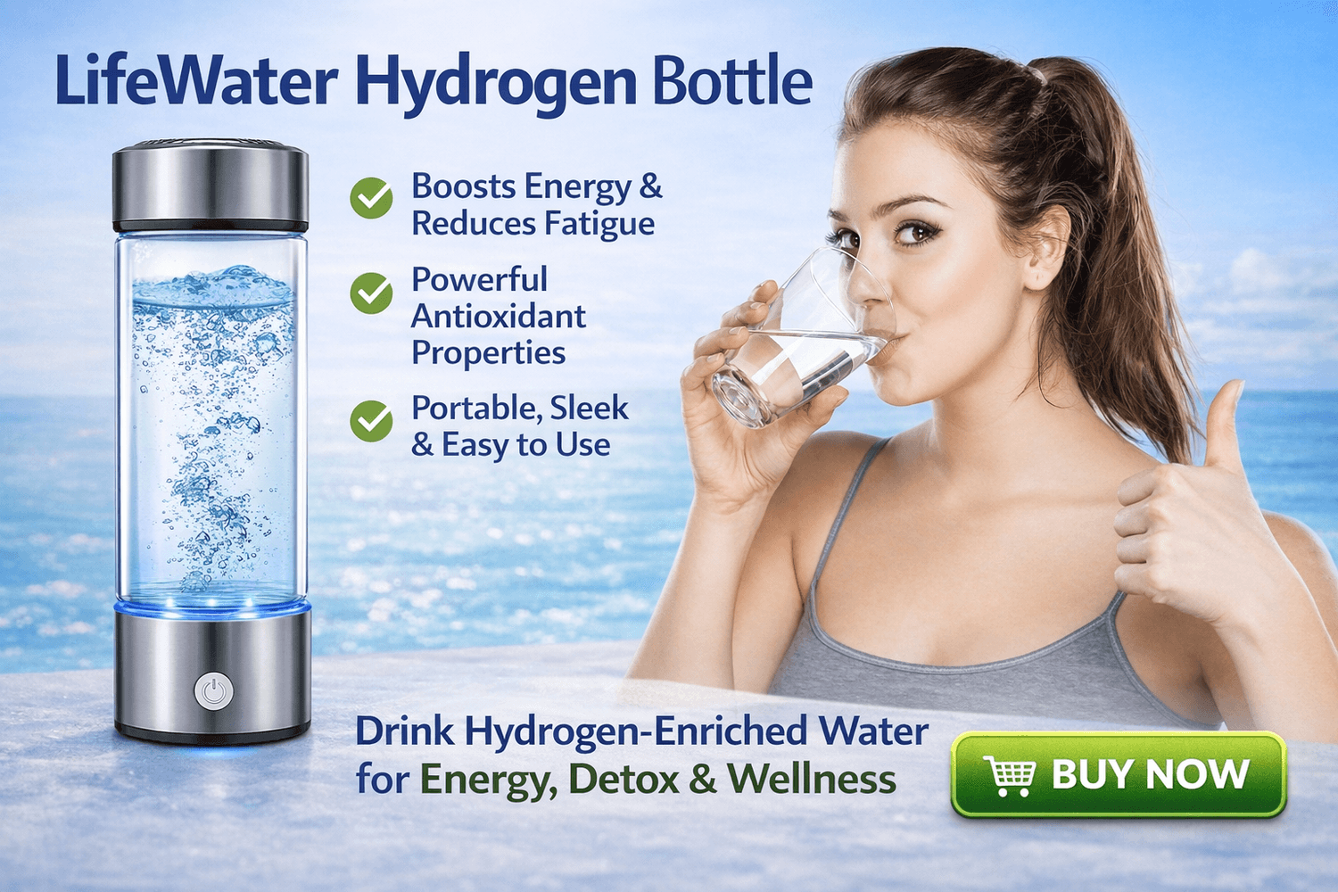 This bottle is designed for people who want a simple, convenient way to improve their daily hydration without relying on expensive bottled hydrogen water or complicated equipment. With just the press of a button, the LifeWater Hydrogen Bottle converts regular water into hydrogen-enriched water in minutes.